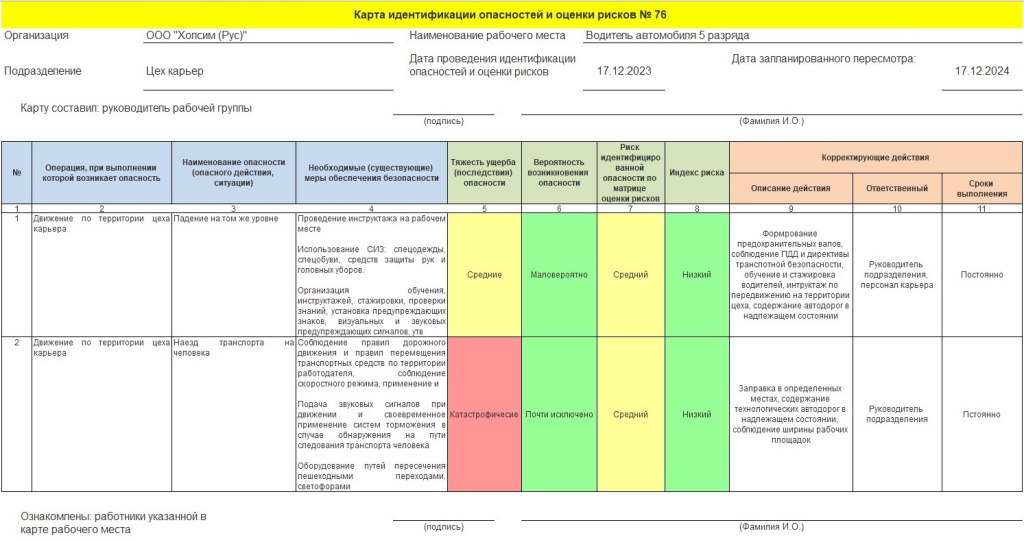 Реализован процесс оценка производственных рисков на рабочих местах направленная на снижение уровня травматизма и развития культуры безопасности. Совместная работа позволяющая выявить возможные опасность, оценить ее и разработать меры для снижения воздействия опасности в ходе выполнения работ.