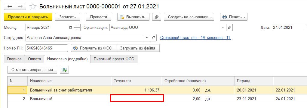 В документе выполняется расчет части пособия, которая оплачивается за счет организации-работодателя. Другая часть, которую начисляет Фонд социального страхования, отражается с нулевым результатом.