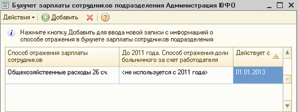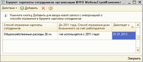 Далее необходимо обратить внимание на вкладку "Бухучет зарплаты" и нажать на "Задать бухучет зарплаты для организации", после чего будет открыт "Бухучет зарплаты сотрудников организации". Чтобы вся заработная плата сотрудников фирмы была учтена по способу отражения "Общехозяйственные расходы 26 счет" следует добавить в регистр соответствующую запись.