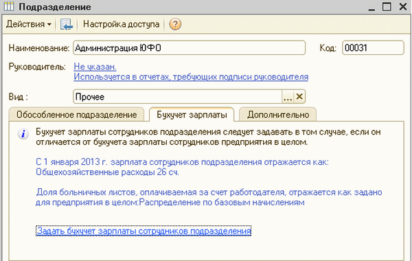 - "Подразделения", "Бухучет зарплаты сотрудников подразделения".