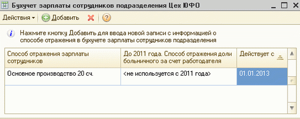 Для учета заработной платы персонала подразделения по способу отражения "Основное производство 20 счет" нужно открыть соответствующее подразделение и внести в регистр определенную запись.