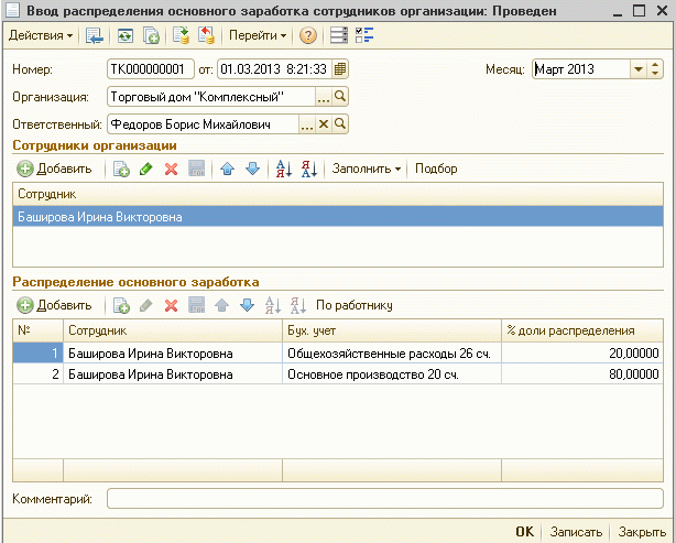 Благодаря документу можно назначить выбранному ранее сотруднику следующее распределение оплаты труда: например, восемьдесят процентов по способу "Основное производство 20 счет" и двадцать процентов по способу "Общехозяйственные расходы 26 счет".
