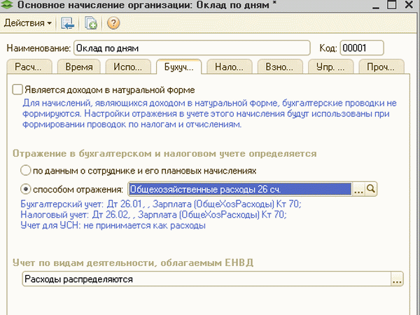 Откроем первый план видов расчета и выберем вид начисления "Оклад по будням". При переходе на закладку "Бухучет и ЕНВД" - выбираем "Общехозяйственные расходы 26 счет".