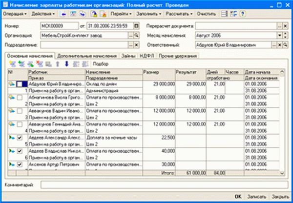 После того, как в информационную базу были занесены все сведения о текущей выработке персонала, отклонениях от графика, разовых удержаниях и начислениях - выполняется расчет оплаты труда и начислений, связанных с ней.