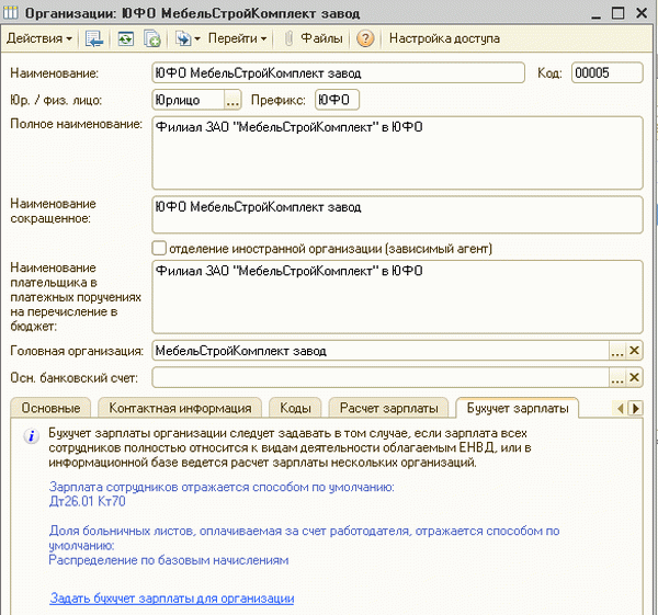 Предусмотрена возможность указания правил отражения зарплаты персонала компании в форме справочника "Организации". Причем в данном случае используется "Бухучет основного заработка организации".