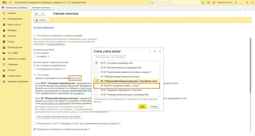 Задаем нужные параметры. Если принято решение применять 40 счет, то заходим Затраты учитываются на счетах и ставим галочку рядом с 40.
