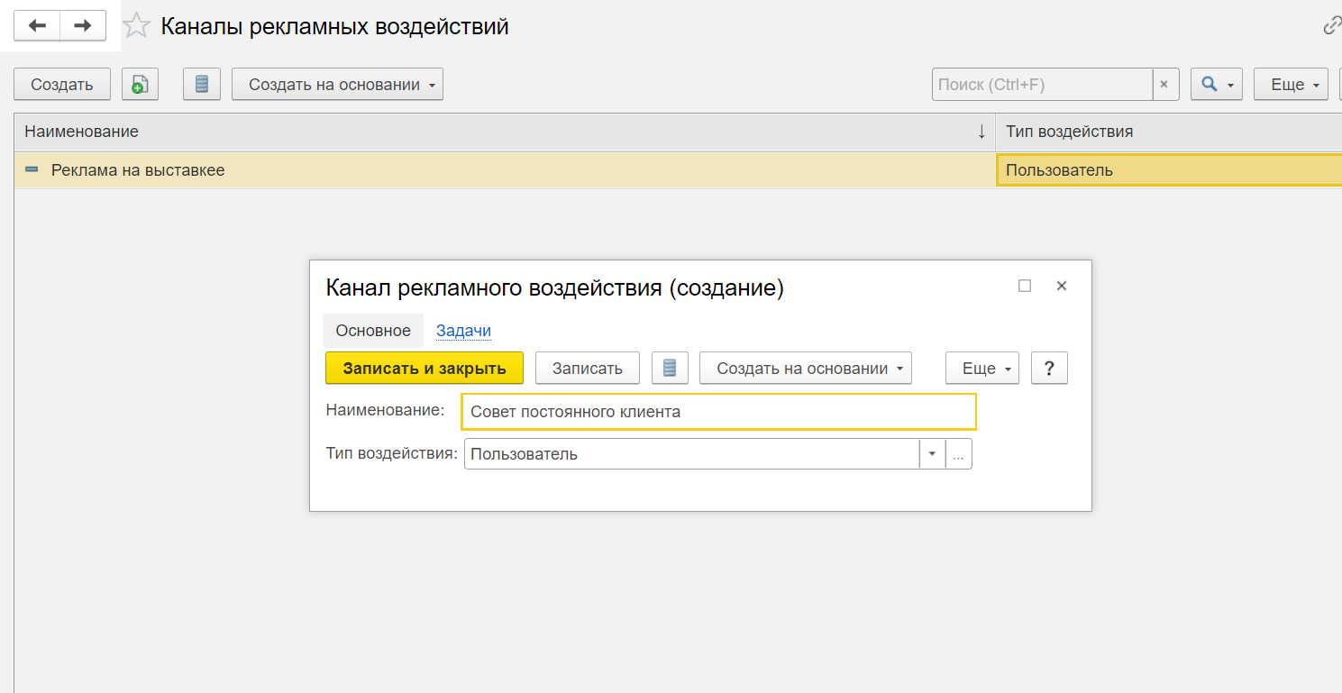 В качестве примера создадим и сохраним несколько каналов рекламного воздействия: выставки (тип - маркетинговое мероприятие).